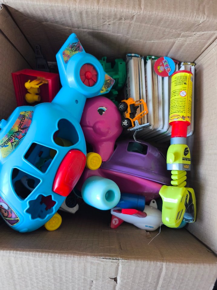 Farklı şekil ve canlı renklere sahip oyuncaklar içeren karışık oyuncak kutusu. Araçlar, figürler ve eğlenceli aletler bulunur. bazıları hasarlı, bu yüzden uygun tutuyorum. hepsi nin fiyatı