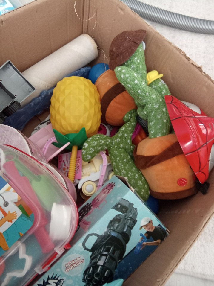 Peluş kaktüs, ananas ve çeşitli renkli oyuncakların bulunduğu karışık oyuncak kutusu.
