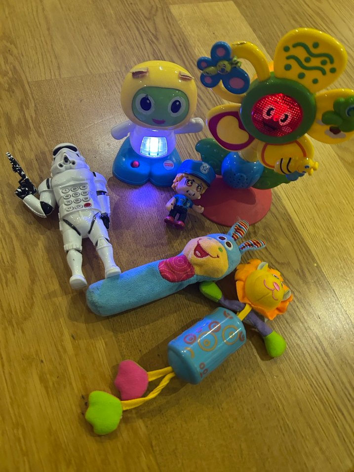 Işıklı robot, çiçek şeklinde oyuncak ve yumuşak çıngıraklar içeren renkli oyuncak seti. Hayal gücünü ve duyuları destekler.