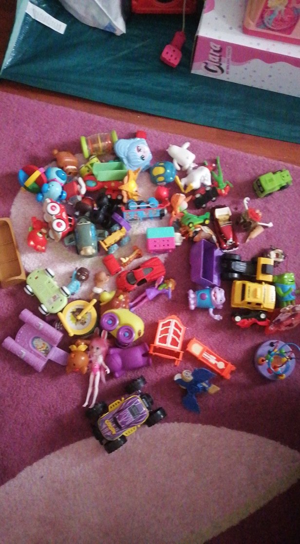 Çeşitli küçük oyuncakların renkli karışımı, araçlar, hayvanlar ve figürler pembe zeminde dağınık durumda. Fiyat sorun