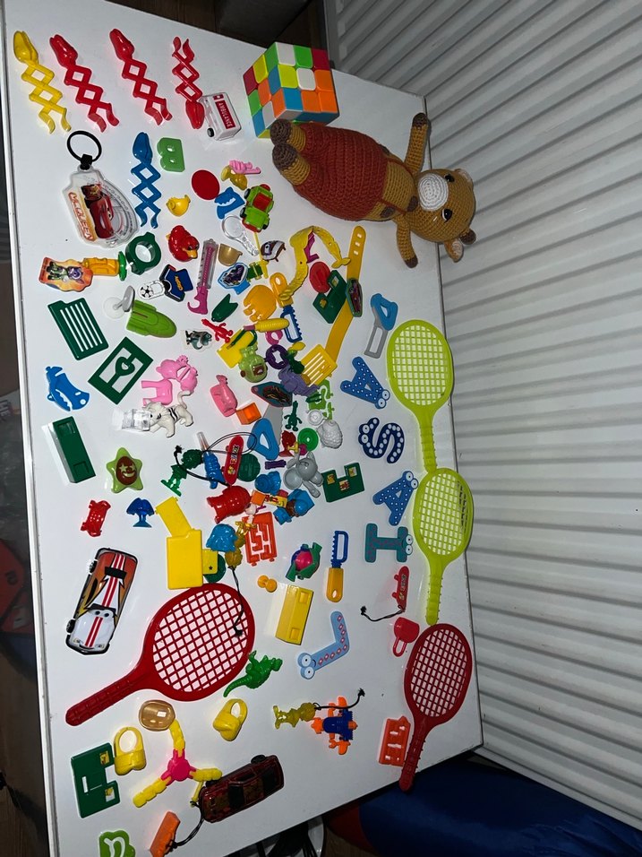 Renkli raketler, oyuncak ayı, Rubik küp ve çeşitli küçük figürlerden oluşan karışık oyuncak seti.