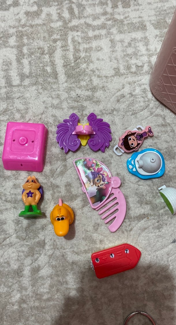 Figürler, tarak ve çeşitli aksesuarlar içeren renkli karışık küçük oyuncak seti. Hayal gücünü destekler.
