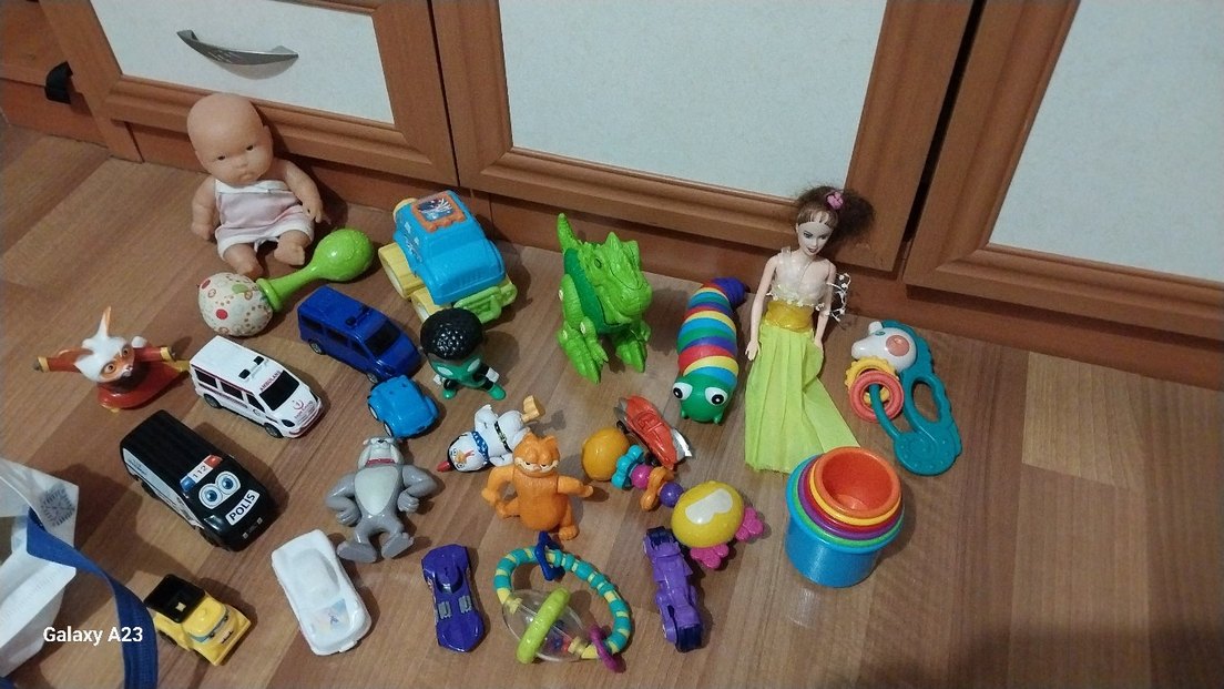 Araba, hayvan, bebek ve üst üste dizilebilen kaplar gibi çeşitli renkli oyuncaklardan oluşan set.