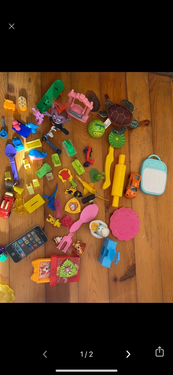 Hayvanlar, araçlar, mutfak gereçleri ve oyun aksesuarlarından oluşan renkli küçük oyuncak seti.