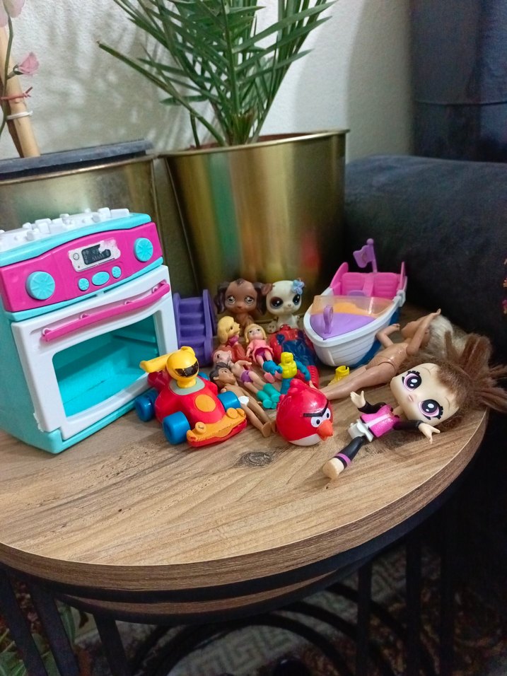 Farklı oyuncaklardan oluşan renkli bir set, içinde bebekler, oyuncak bot ve karakter figürleri bulunur.