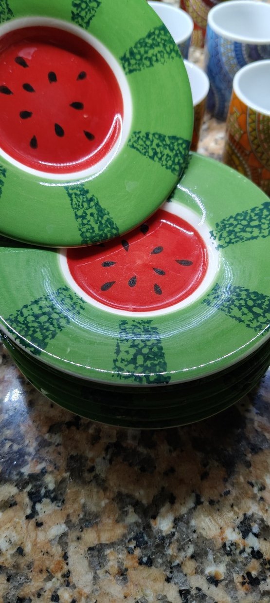 Canlı kırmızı ve yeşil renklerle karpuz desenli renkli tabak seti, yiyecek servisi için uygundur.