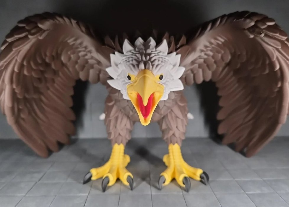 Detaylı tüyleri ve canlı sarı gagası ile renkli kartal figürü, kanatları açık dinamik bir pozda duruyor.