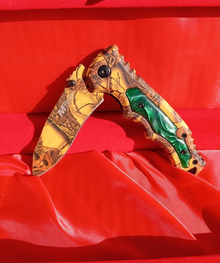Renkli ve çok desenli sapı, ergonomik tutuşu ve keskin bıçağı olan katlanabilir bıçak. Canlı tasarım ve işlevsellik bir arada.