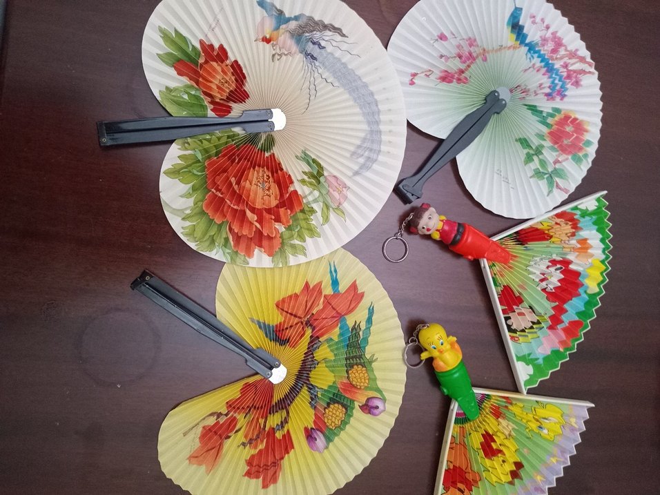 Çiçek ve kuş desenli, renkli çok renkli katlanabilir el yelpazeleri seti, hafif malzemeden yapılmıştır. birtanesi kenar yirtik 6 adet