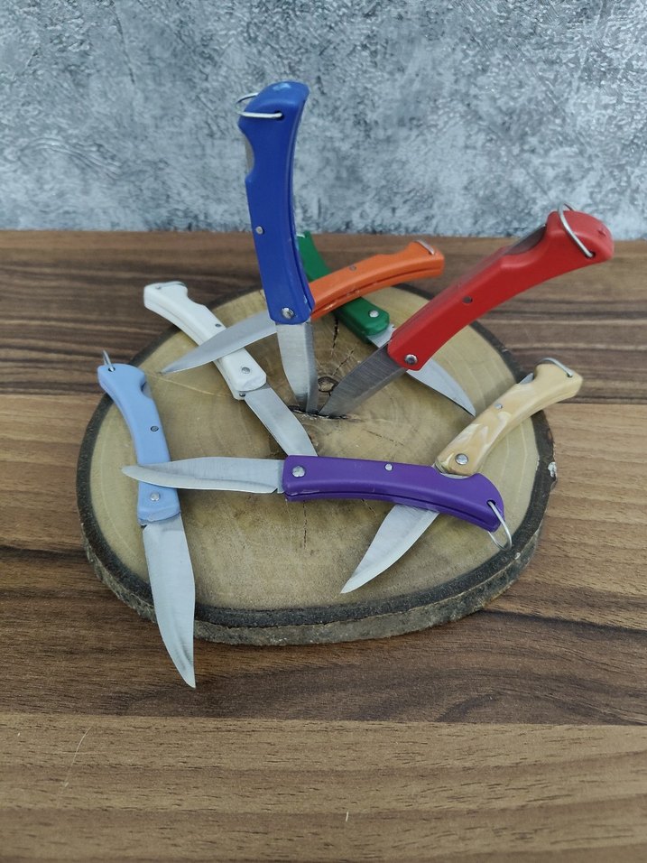 Her biri farklı canlı renkte saplara sahip keskin bıçaklı renkli katlanır cep bıçakları anahtarlığa takılabilen sırttan kilitli