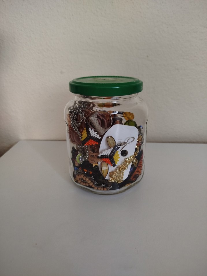 içinde çeşitli koyu ve çok renkli küçük aksesuarlar bulunan şeffaf kavanoz.
