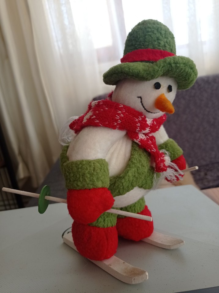 Yeşil şapka ve eldivenli, kırmızı atkı ve botlu renkli kardan adam biblo, tahta kayaklar üzerinde duruyor. ⛷️