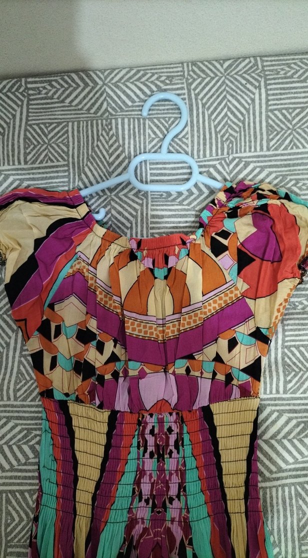 Renkli, kayık yaka uzun elbise, drapeli tasarımı ve canlı tie-dye deseniyle, yumuşak sentetik kumaştan üretilmiştir.Beli lastikli olup standart bedendir.