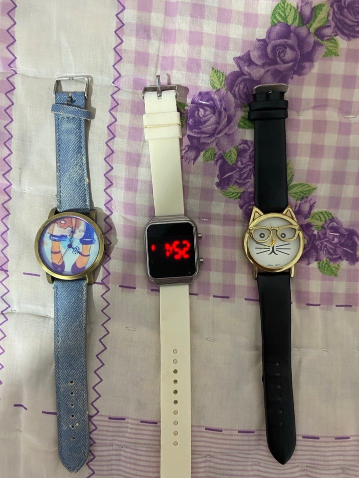 Renkli, tokalı kayışlara sahip kadın kol saatleri; minimalist tasarımlı kedi figürleri ve dijital ekran içerir. Trendy casual stil için uygundur. ⌚