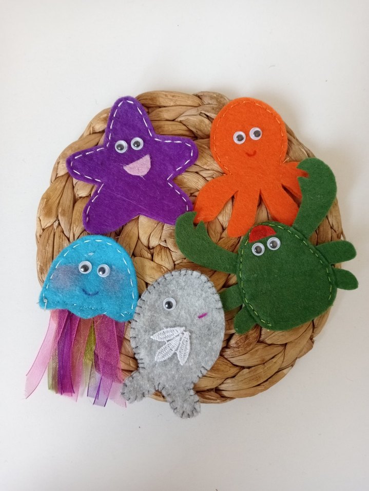 Mor deniz yıldızı, turuncu ahtapot, mavi denizanası, gri balık ve yeşil yengeçten oluşan renkli keçe oyuncak seti. keçe parmak kuklaları tanesi 20tl. son fiyattır.