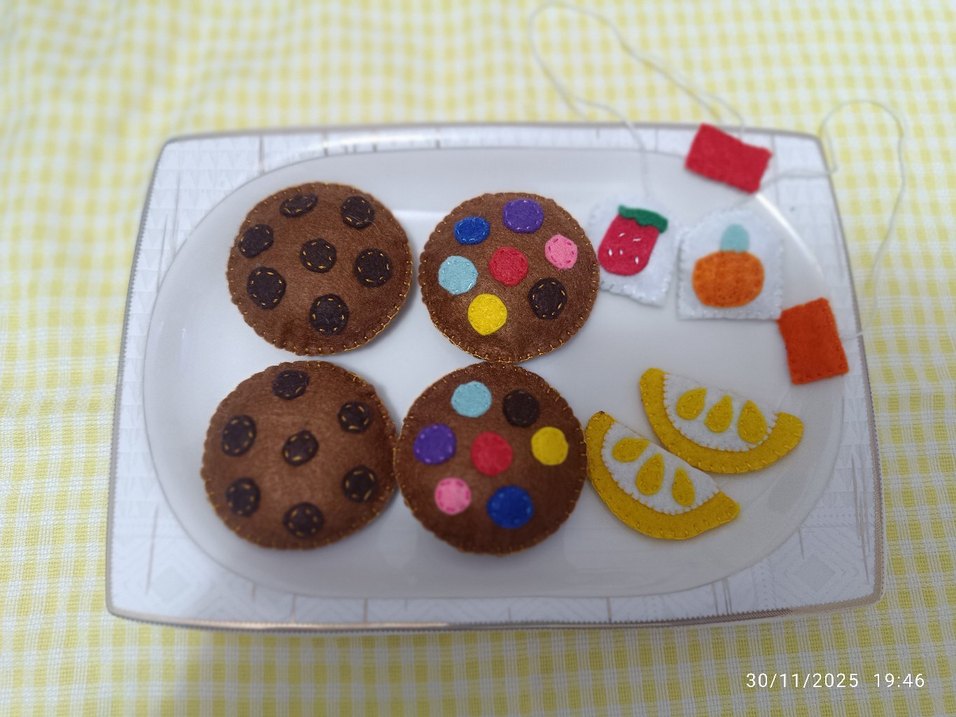 Çikolata ve renkli noktalarla keçe kurabiyeler, meyve ve meyve suyu parçaları içeren renkli keçe eğitim oyuncak seti.