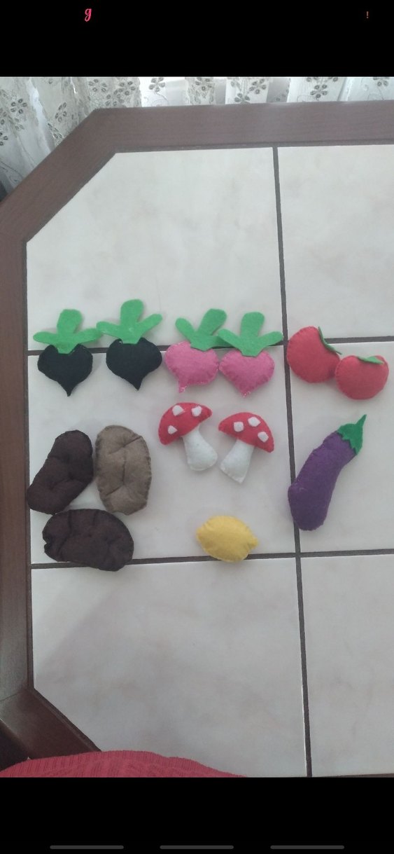 (2 adet kara turp 2 adet pembe turp )(2 adet domates ) (3 adet patates )(2 adet mantar )(1 adet patlican )(1 adet limon ) toplam 13 parça keceyle el üretimdir. elyaf dolgululudur .