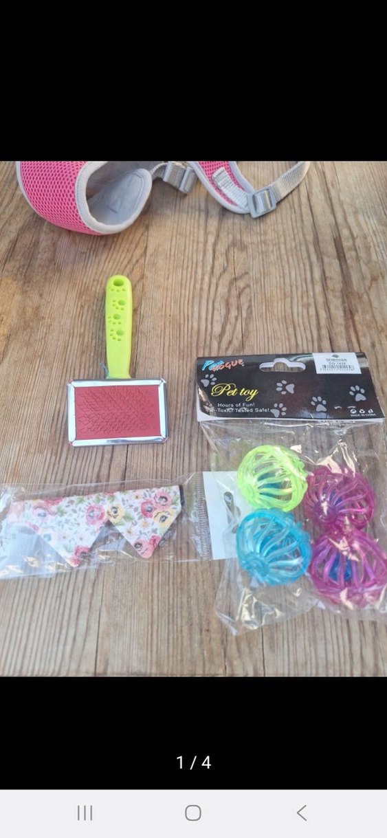 Tüy tarama fırçası, üç renkli top ve çiçek desenli tasma içeren renkli kedi aksesuar seti.