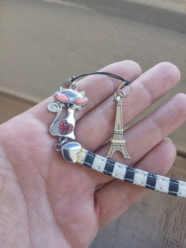 Renkli kedi aksesuarı, kalpli kedi figürü ve Eyfel Kulesi kolyesi ile camel ve siyah çizgili askıya bağlıdır.