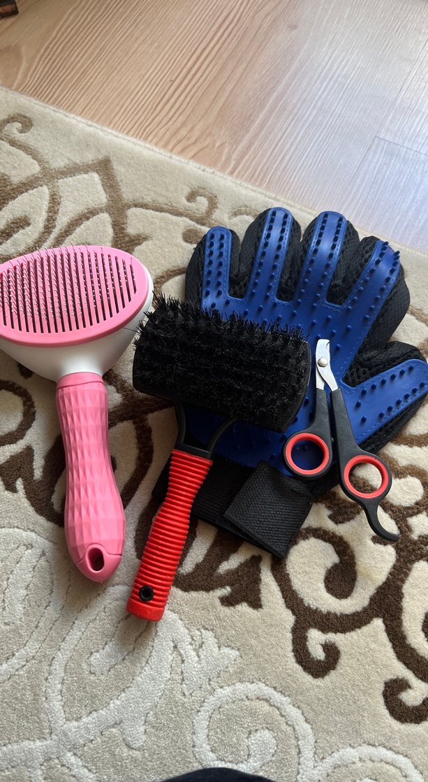 Pembe fırça, mavi tarama eldiven, makas ve kırmızı saplı fırcalama kedi bakım seti. Ürünler birkaç sefer kullanıldı makas hiç kullanılmadı