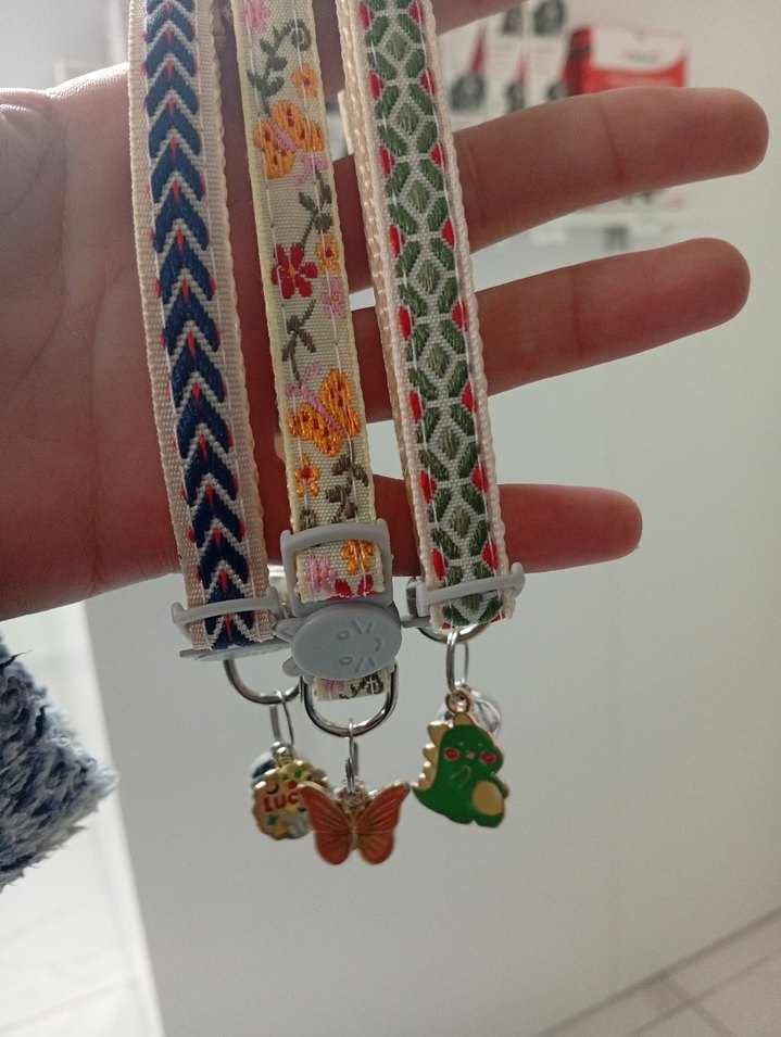 Farklı desenlerde ve küçük sallanan figürlerle tasarlanmış üç renkli kedi boyun tasması seti.