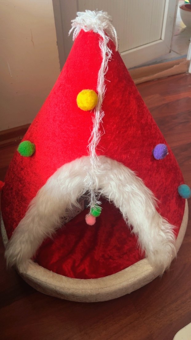 Kırmızı yumuşak kumaş ve beyaz kürk detaylı, renkli ponponlu kedi çadırı. Kediler için rahat bir dinlenme alanı sunar.