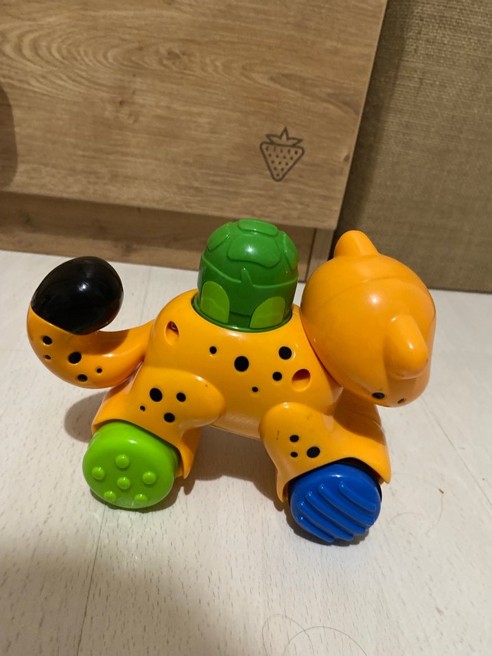 Sarı, yeşil, mavi ve siyah renklerde, dokunsal oyun için farklı dokulu parçaları olan renkli kedi oyuncak üstündeki yeşili aşağı indirince emekleme arkadaşı gibi gidiyor ve kuyruk sallıyor fısher price