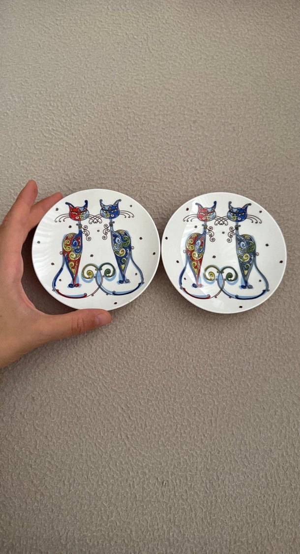 Birkaç ufak çiziği var kırık çatlak yok İki adet, beyaz zeminde renkli desenli sanatsal kedi tasarımlı tabak seti. Her tabakta stilize iki kedi yer alır.