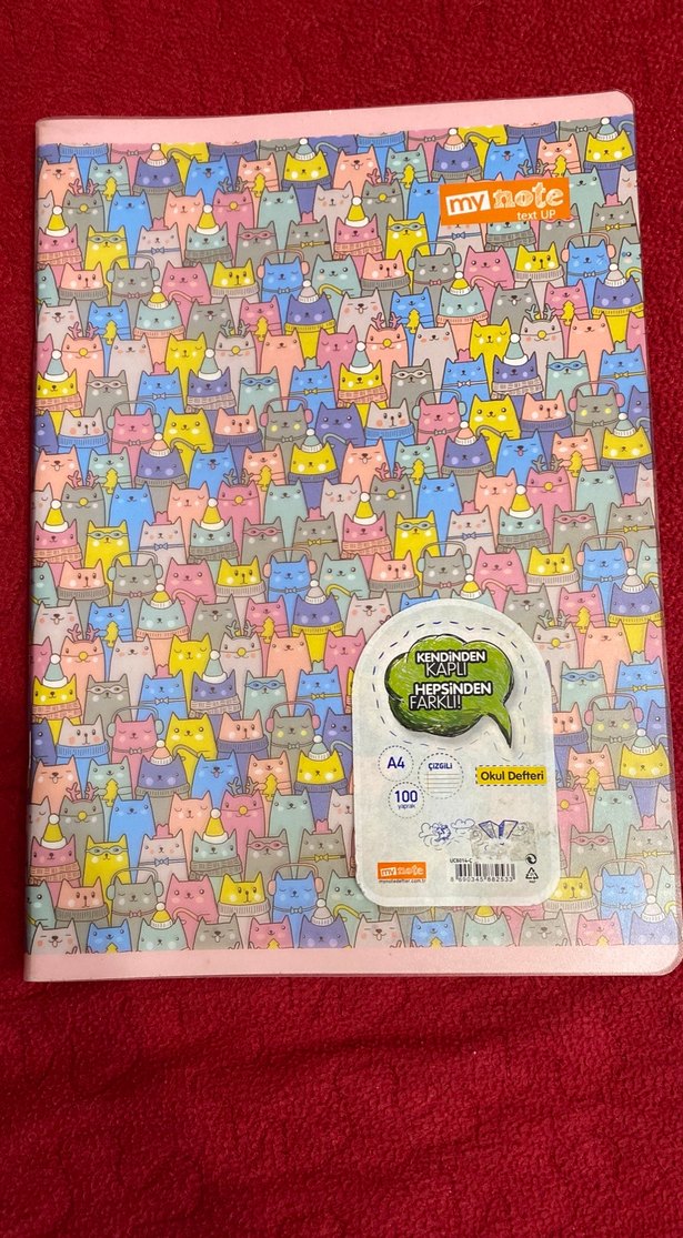 Renkli kedi desenli A4 defter, 100 sayfa içerir ve okul için uygundur. Üzerinde "ATRSINDEN" yazısı bulunur. Hiç kullanılmamış.