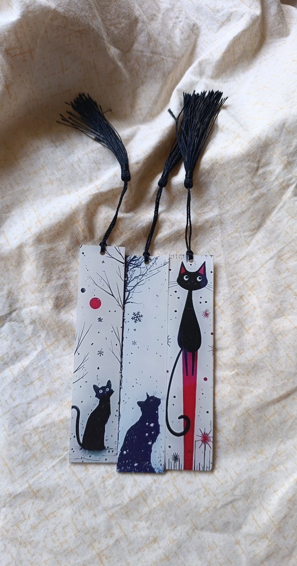 Üzerinde siyah kedi illüstrasyonları bulunan, kolay kullanım için püsküllü renkli kitap ayraçları seti. Gri zemin üzerinde eğlenceli kedi figürleri yer alır. 3 lü settir