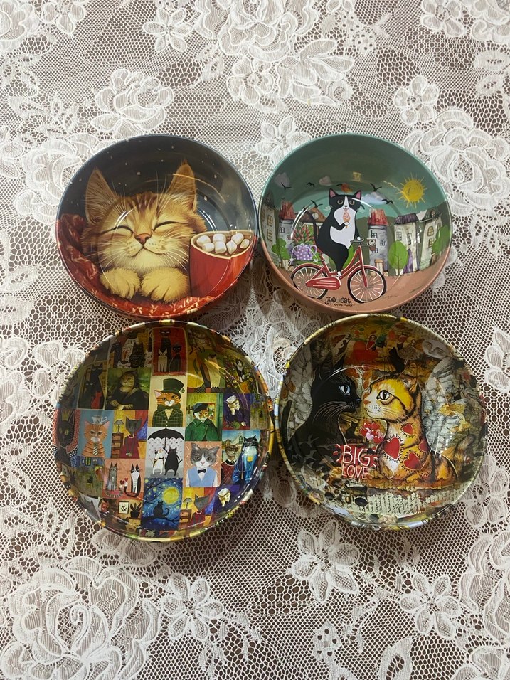 Farklı sanatsal kedi figürleriyle renkli kedi mama kapları seti. Metal kaplar