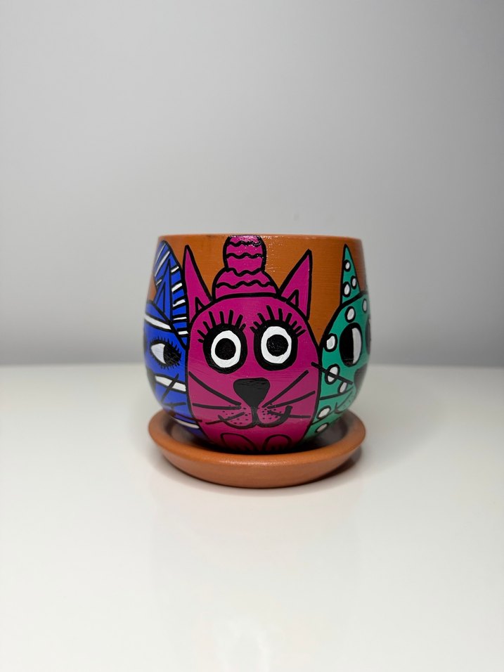 Tamamen el emeğiyle boyanmış, tek adet üretilmiş özel bir saksıdır. Seri üretim değildir, her biri benzersizdir. Küçük boyutu sayesinde sukulent, kaktüs ve mini bitkiler için idealdir. Doğal yapısı sayesinde bitkinizin köklerinin hava almasına yardımcı olur. Vernik ile korumalıdır Ölçü: 9x9 cm Salon, mutfak, ofis ve balkon dekorasyonu için uygundur. Hediye olarak da tercih edilebilir. Bitki dahil değildir. Özenle paketlenerek gönderilir.