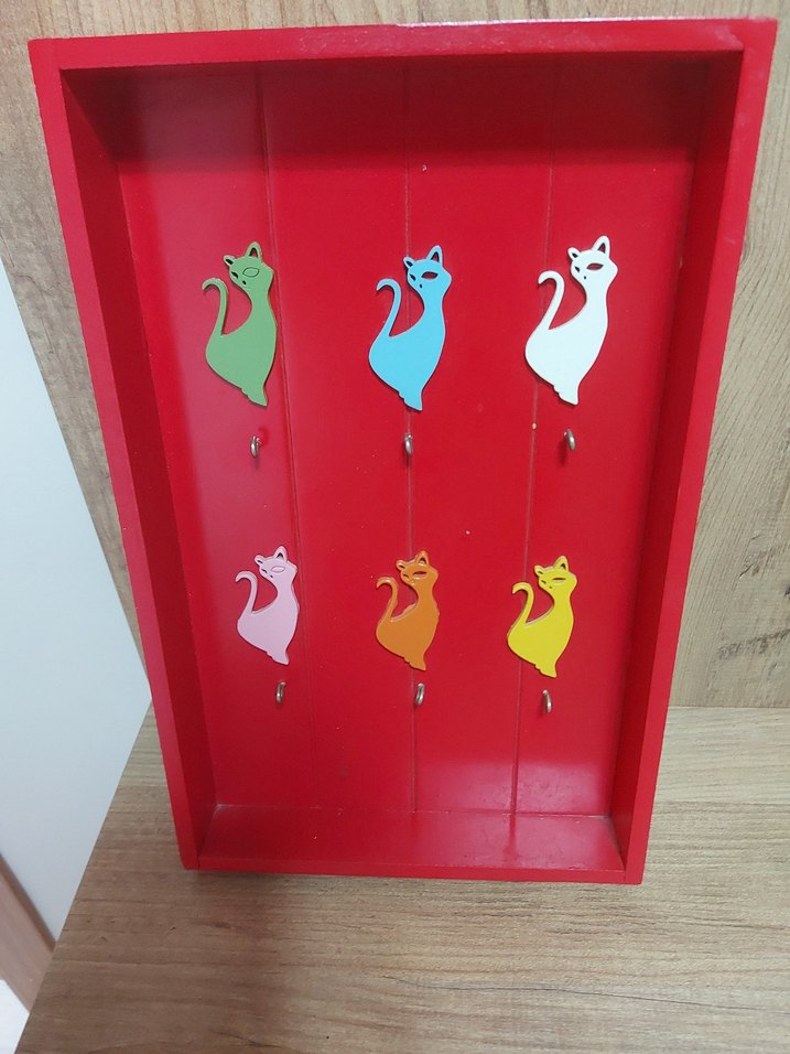 Kırmızı renkte, renkli kedi figürlü askıları olan çocuk rafı. Küçük eşyalar için düzen sağlar ve çocuk odasına neşeli bir dokunuş katar.