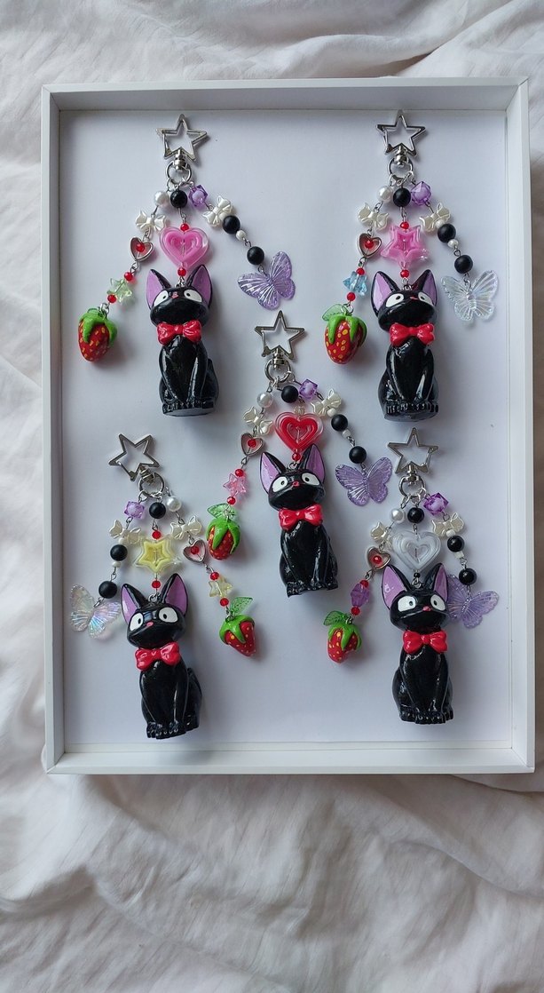 Kırmızı papyonlu siyah kediler, çilek, kalp ve kelebek figürlü renkli anahtarlık seti, yıldız şekilli klipslerle tane 200 tl