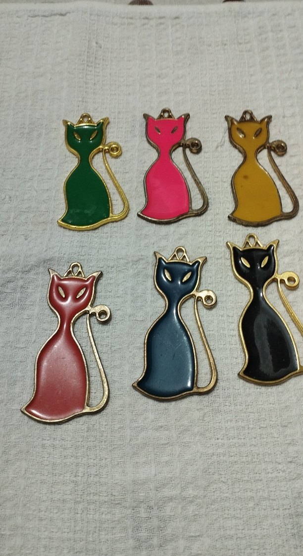 Altın detaylı, çeşitli canlı renklerde kedi figürlü kolye uçları, kedi severler için uygun. boy 8 en 3 toplam 6 adet