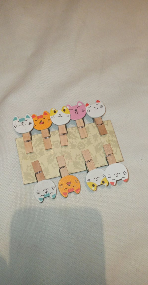 Çeşitli sevimli kedi yüzleriyle süslenmiş renkli ahşap mandallar, küçük notlar veya dekorasyon için uygun.