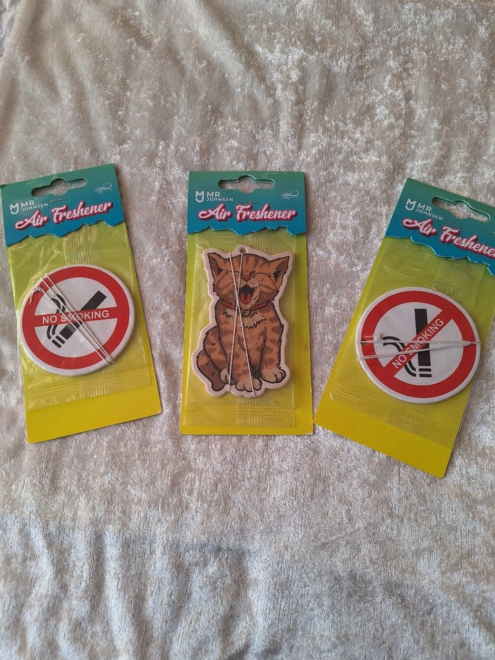 Kahverengi kedi ve sigara içilmez desenli renkli oto kokuları, aracınıza hoş koku ve dekorasyon sağlar.