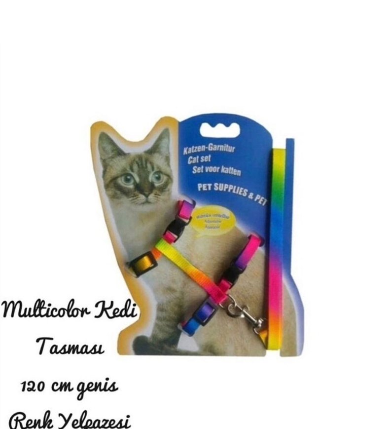 Renkli, çoklu renkli kedi tasması ve göğüs tasması . 120 cm genişliğinde, ayarlanabilir ve konforlu tasarım. Sıfır üründür.