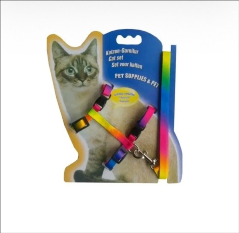 Ayarlanabilir renkli kedi göğüs tasması ve uyumlu tasma seti, rahat kullanım için canlı çok renkli tasarıma sahiptir.