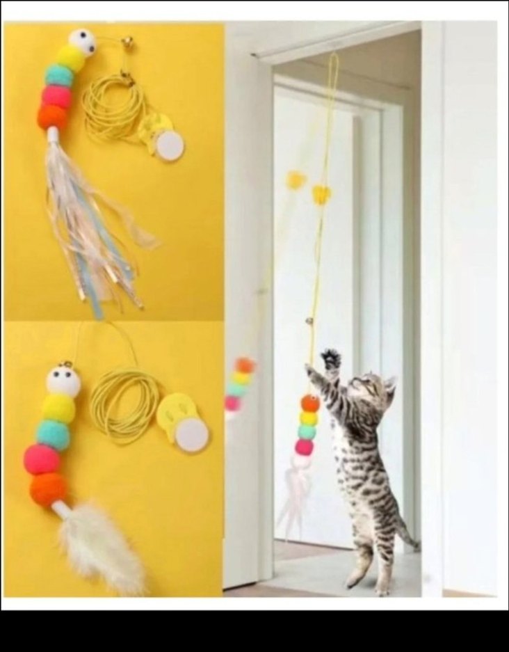 Tüyler ve yumuşak toplardan oluşan renkli kedi kapı oyuncağı, kedilerin eğlenmesi için tasarlanmıştır.