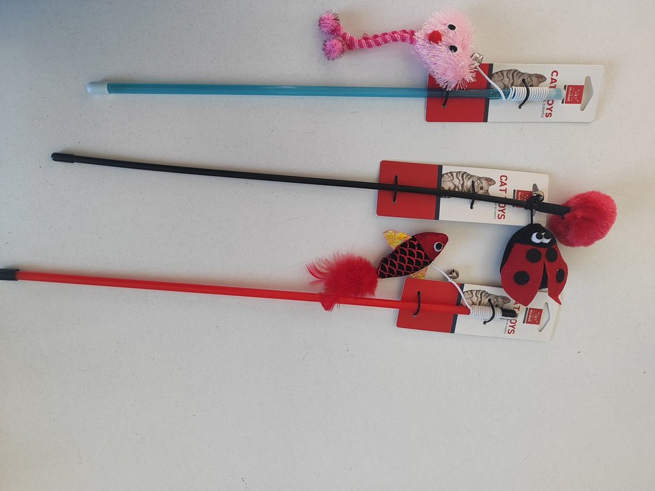 Kırmızı, mavi ve siyah saplı renkli kedi oltası oyuncakları, yumuşak ve eğlenceli balık ve tüylü fare figürleriyle.