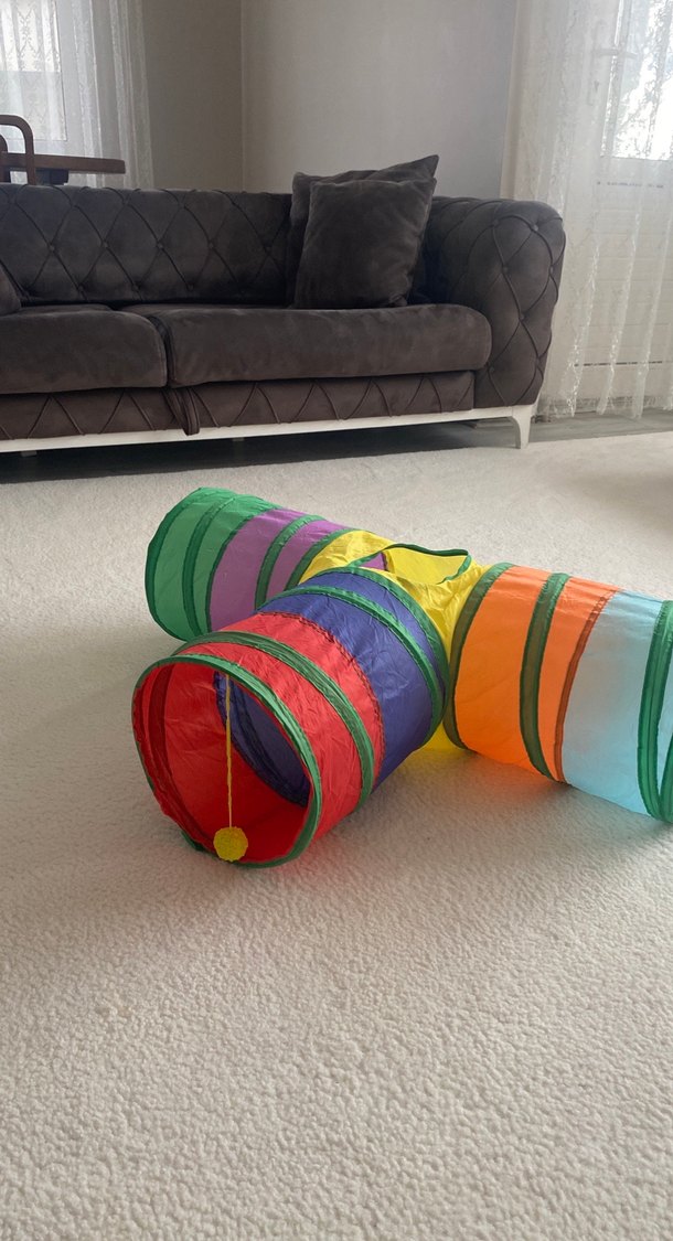 Renkli, hafif kumaştan yapılmış çok bölmeli kedi oyun tüneli, aktif oyun ve keşif için uygundur.