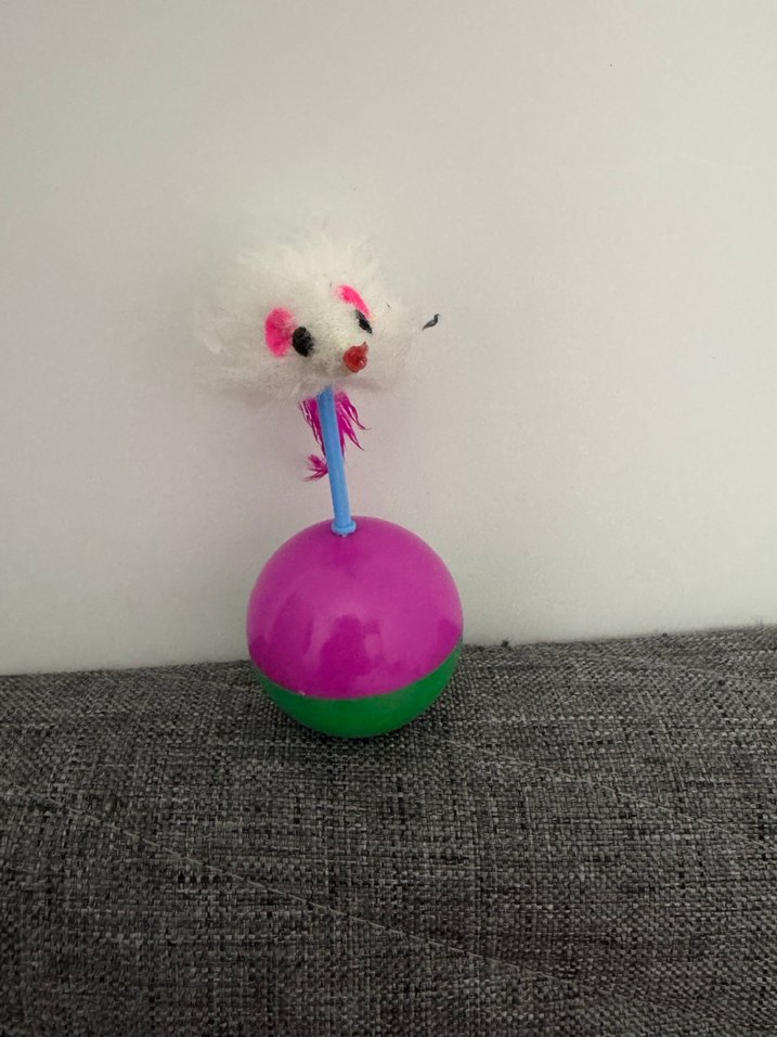 Mor ve yeşil taban üzerinde beyaz tüylü fareli renkli kedi oyuncağı, kedilerin ilgisini çeker. Kedim neredeyse hiç oynamadı sağlam