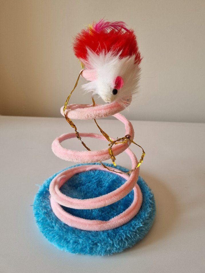 Pembe spiral taban ve üstünde tüylerle süslenmiş fare bulunan renkli kedi oyuncağı.