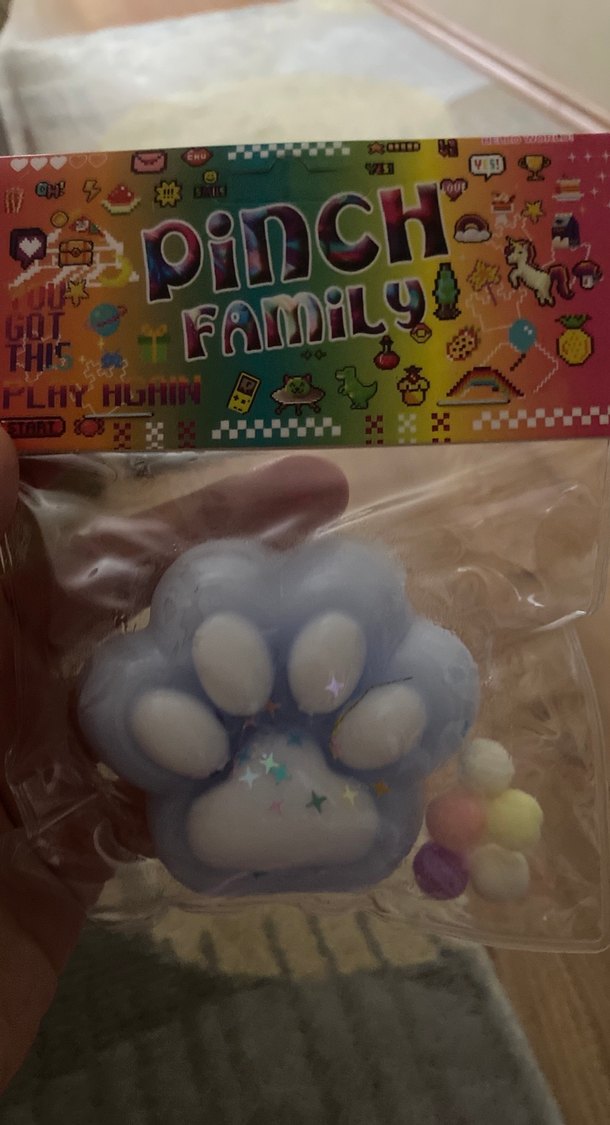 Pastel renklerde kedi pençesi şeklinde yumuşak dokulu oyuncak, küçük renkli toplarla birlikte. Üzerinde 'Pinch Family' yazısı bulunur.