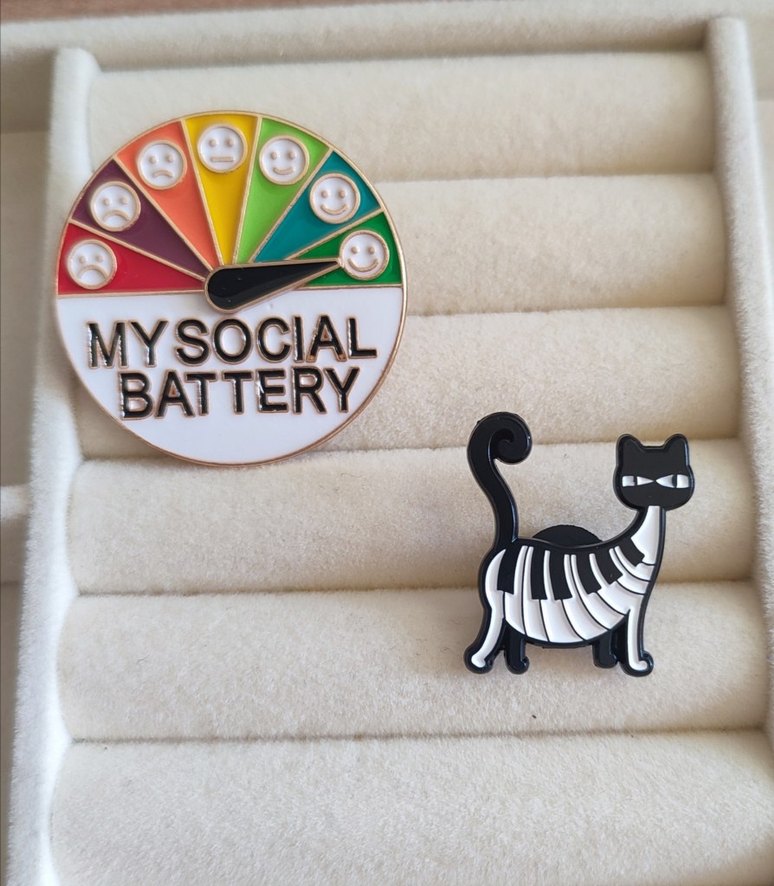 Sosyal pil göstergesi ve piyano klavyesi desenli kedi figürlü renkli rozet seti.
