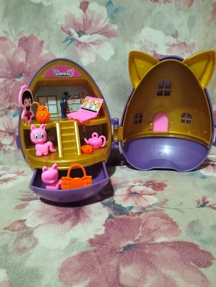 Renkli, kedi şeklinde mini oyun seti. İçinde küçük figürler, mobilyalar ve aksesuarlar bulunur. Hayal gücünü destekler.