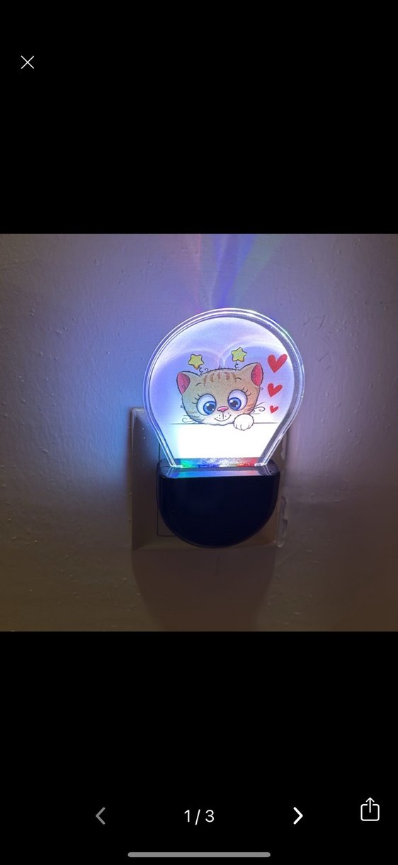 Kalp ve yıldızlarla süslü sevimli kedi tasarımlı, renkli ve yumuşak ışık veren gece lambasıdır. Prizden kolayca kullanılır.