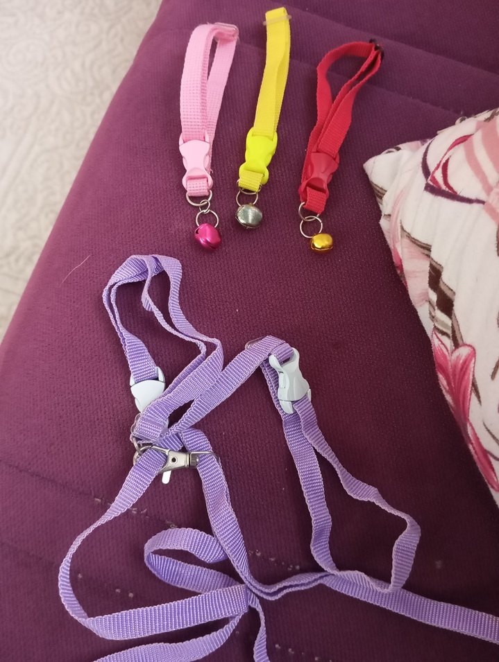 Mor ayarlanabilir kedi tasması ve pembe, sarı, kırmızı küçük zillerle renkli üç kedi tasması seti.