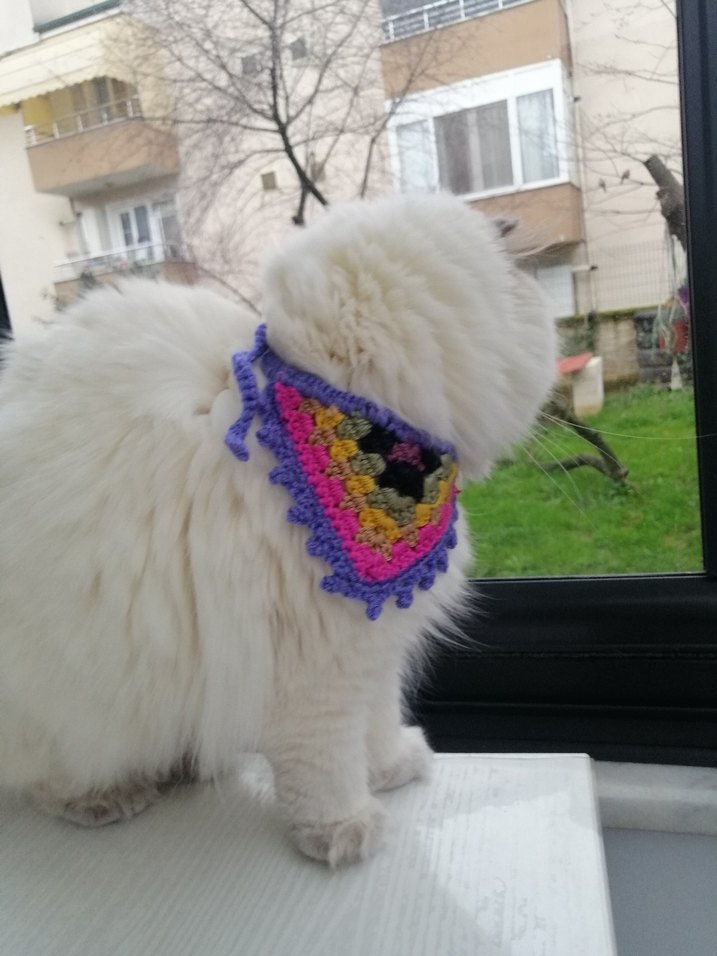 Mor, pembe ve sarı gibi canlı renklerde örülmüş renkli kedi boyunluğu, kedinin boynuna rahatça oturur.